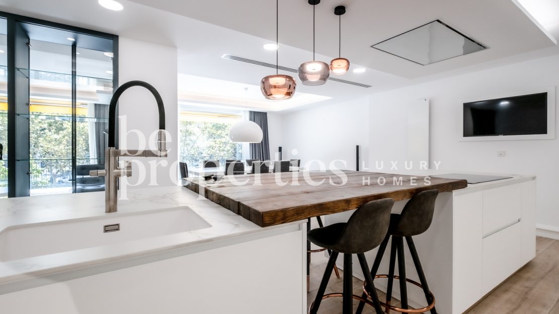 Salón comedor de 80 m2 distribuido por gran zona de salón con sofá de piel y grandes ventanales que le da una luz natural al piso espectacular. Zona de comedor con gran mesa y salida a terraza de 60 m2 con vistas a la Diagonal. Cocina abierta tipo office con electrodomésticos de alta gama.